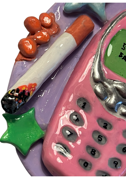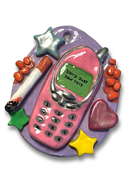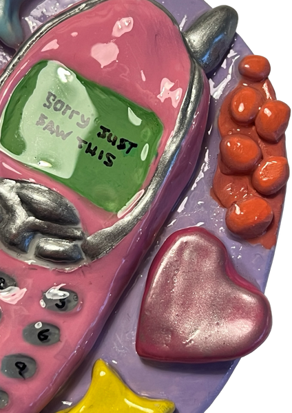 'SORRY JUST SAW THIS' Wall Hanging Original Artwork Multi-media - Clay, Acrylic paint, Mica Powder and Resin 11.6cm x 9.5cm Edition - 1 Signed by Artist Year - 2025